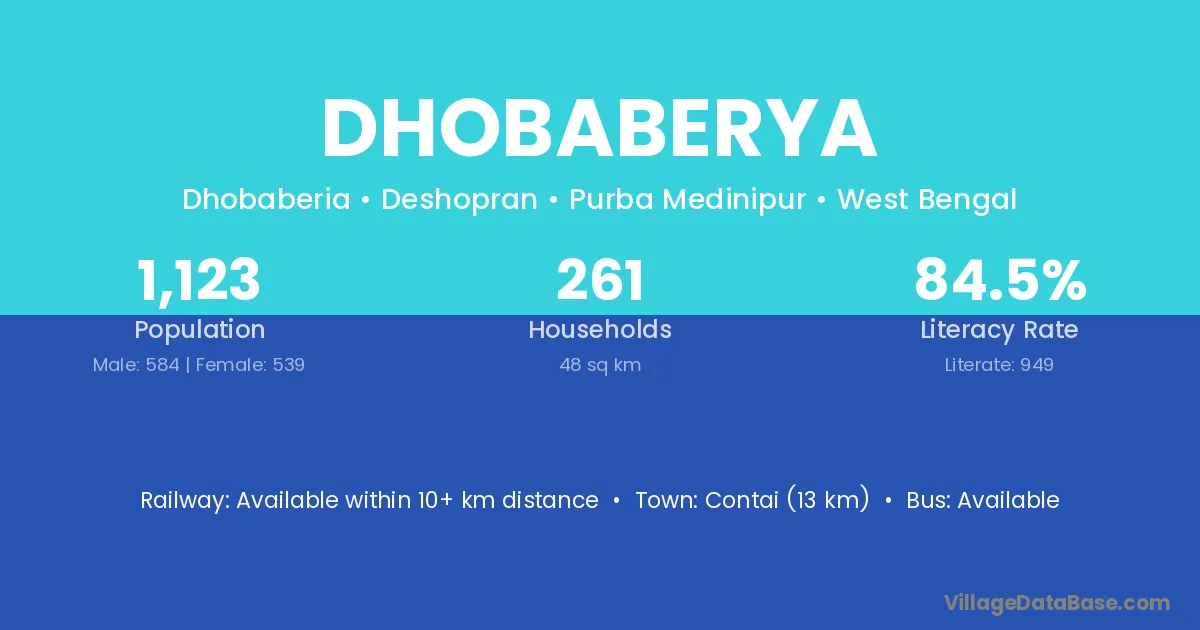 Contai (13 km) is the nearest town to Dhobaberya village for major economic activities and is located approximately 13 km away.