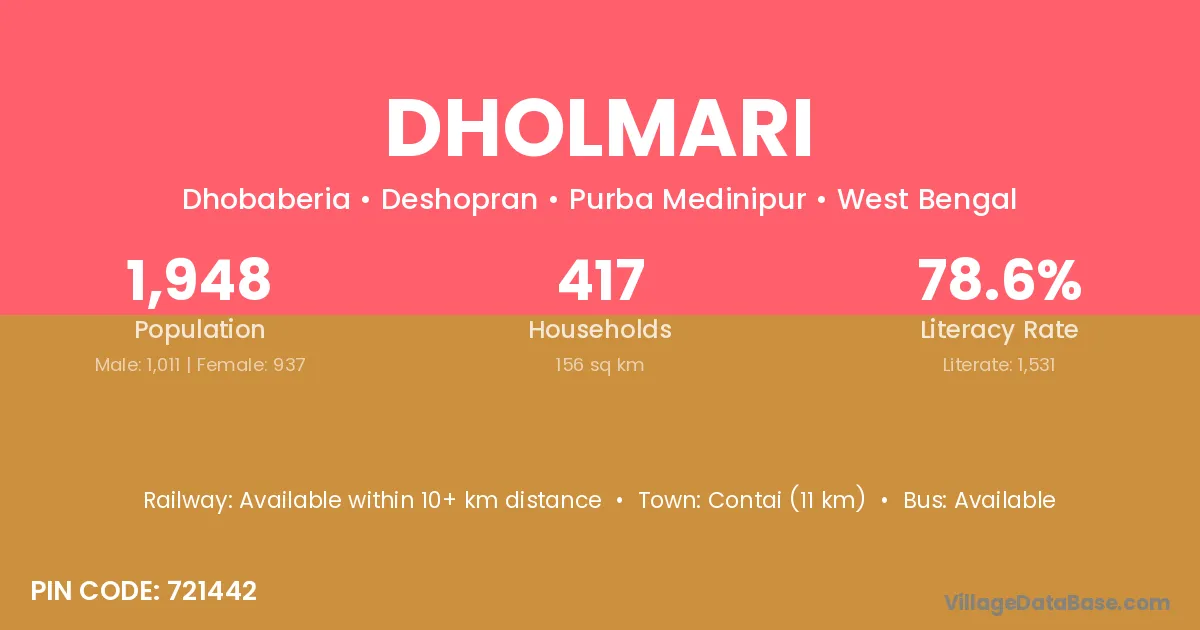 Contai (11 km) is the nearest town to Dholmari village for major economic activities and is located approximately 11 km away.