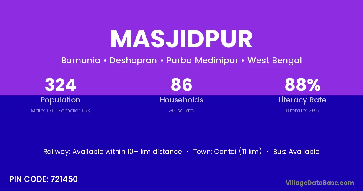 Contai (11 km) is the nearest town to Masjidpur village for major economic activities and is located approximately 11 km away.