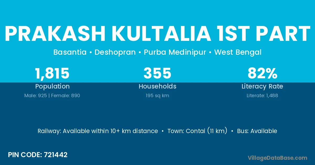 Contai (11 km) is the nearest town to Prakash Kultalia 1st Part village for major economic activities and is located approximately 11 km away.