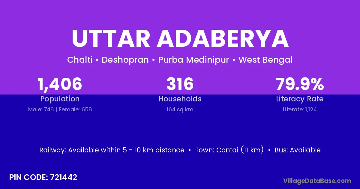 Contai (11 km) is the nearest town to Uttar Adaberya village for major economic activities and is located approximately 11 km away.