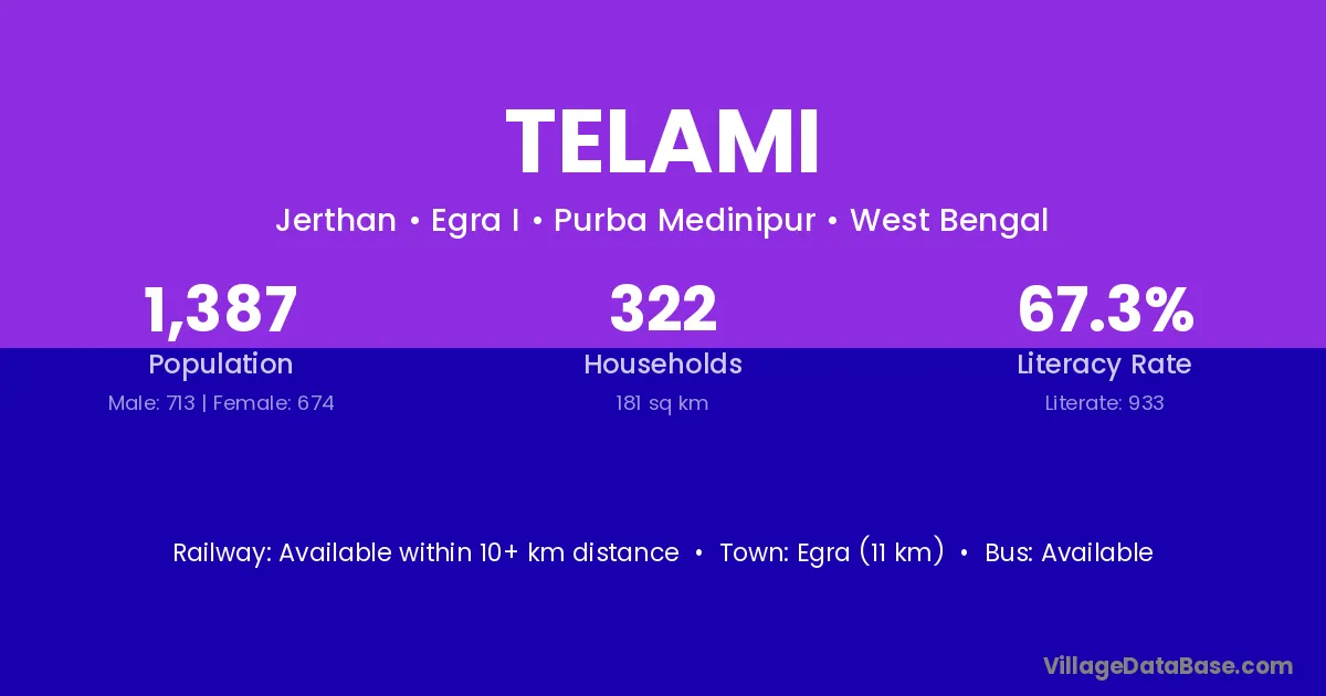 Egra (11 km) is the nearest town to Telami village for major economic activities and is located approximately 11 km away.