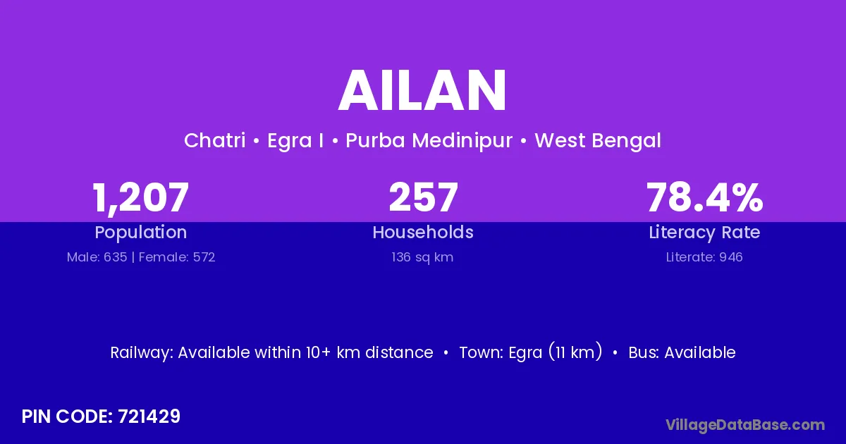 Egra (11 km) is the nearest town to Ailan village for major economic activities and is located approximately 11 km away.