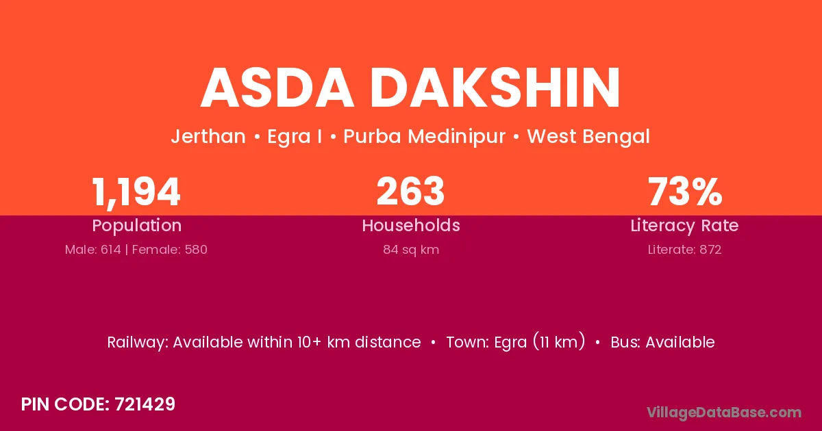 Egra (11 km) is the nearest town to Asda Dakshin village for major economic activities and is located approximately 11 km away.