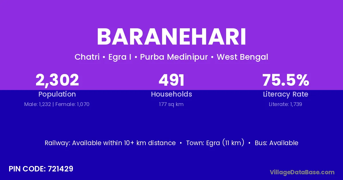 Egra (11 km) is the nearest town to Baranehari village for major economic activities and is located approximately 11 km away.
