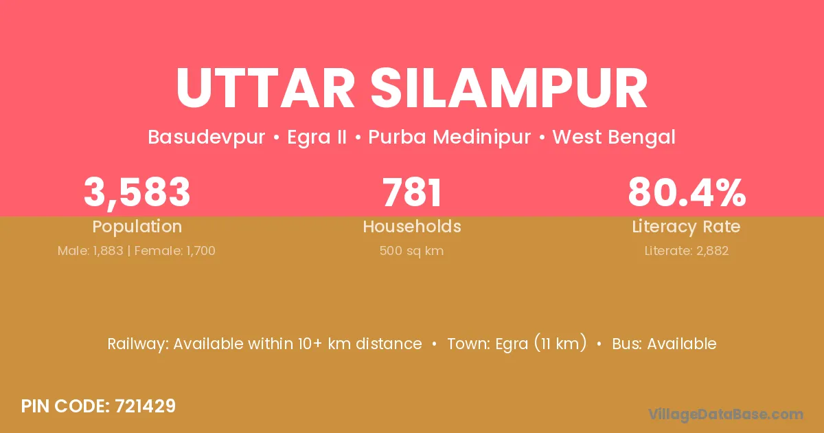 Egra (11 km) is the nearest town to Uttar Silampur village for major economic activities and is located approximately 11 km away.