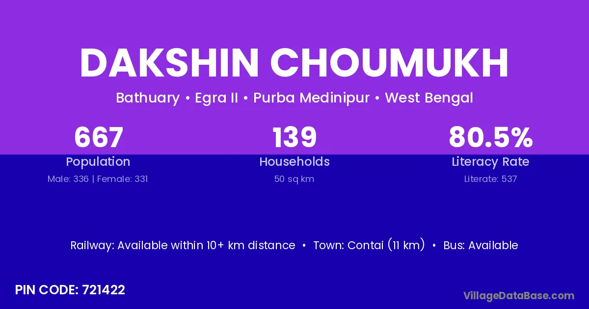 Contai (11 km) is the nearest town to Dakshin Choumukh village for major economic activities and is located approximately 11 km away.
