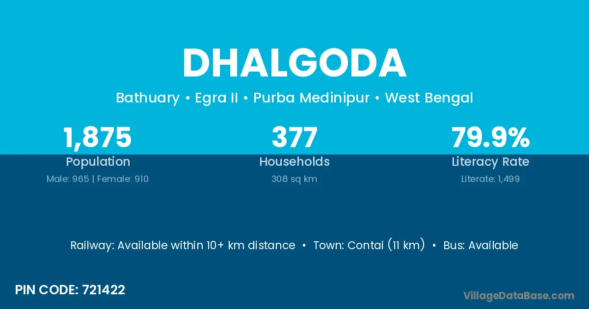 Contai (11 km) is the nearest town to Dhalgoda village for major economic activities and is located approximately 11 km away.