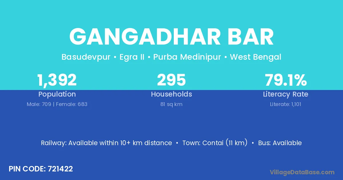 Contai (11 km) is the nearest town to Gangadhar Bar village for major economic activities and is located approximately 11 km away.