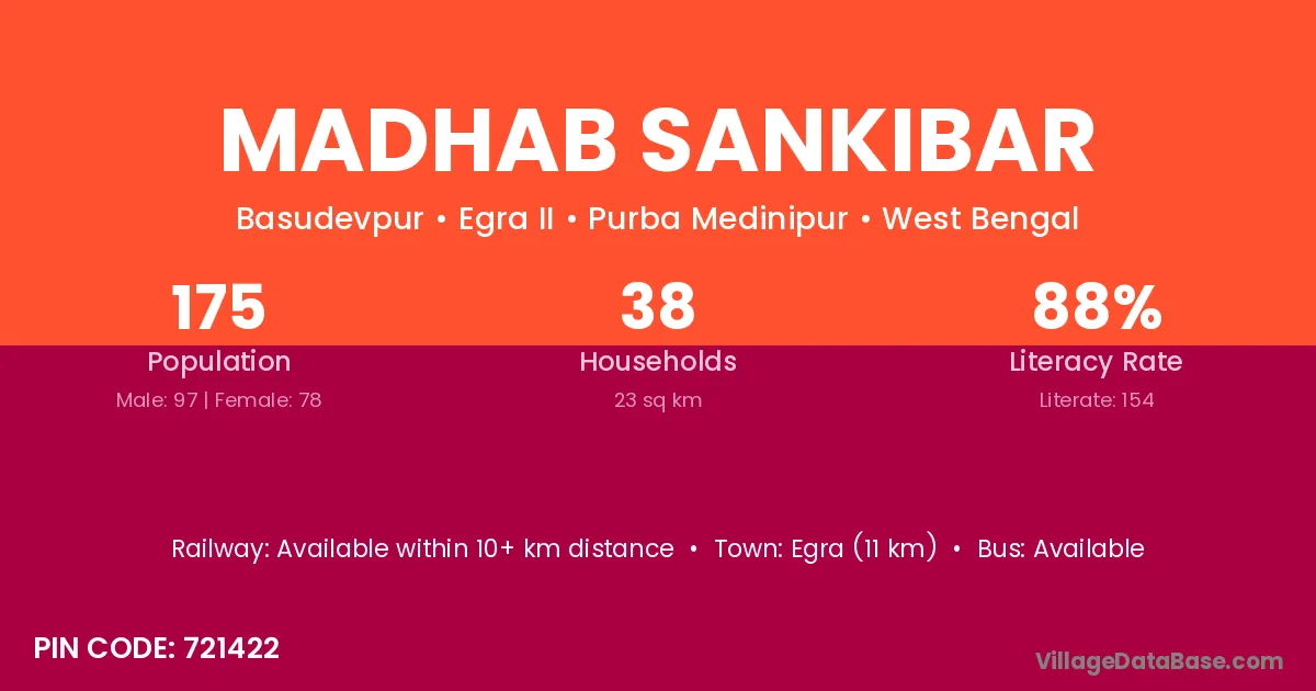 Egra (11 km) is the nearest town to Madhab Sankibar village for major economic activities and is located approximately 11 km away.