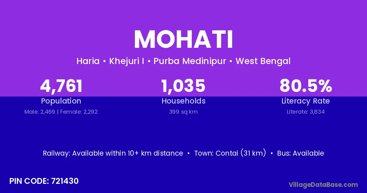 Contai (31 km) is the nearest town to Mohati village for major economic activities and is located approximately 31 km away.