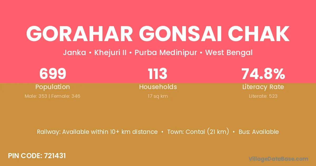 Contai (21 km) is the nearest town to Gorahar Gonsai Chak village for major economic activities and is located approximately 21 km away.
