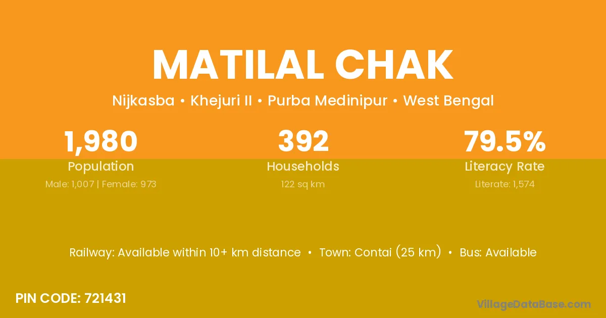 Contai (25 km) is the nearest town to Matilal Chak village for major economic activities and is located approximately 25 km away.