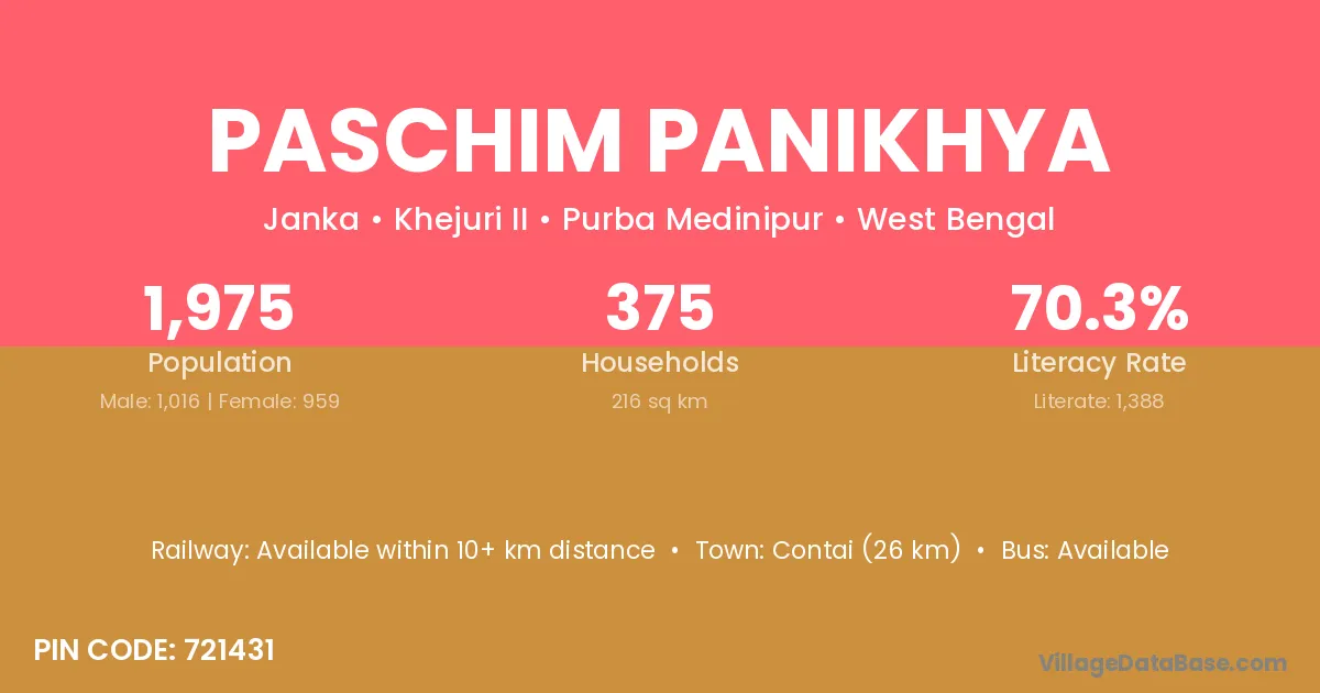 Contai (26 km) is the nearest town to Paschim Panikhya village for major economic activities and is located approximately 26 km away.