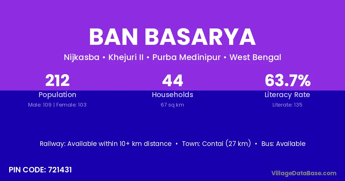Ban Basarya village is located in the Khejuri II Subdivision of the Purba Medinipur district in West Bengal.