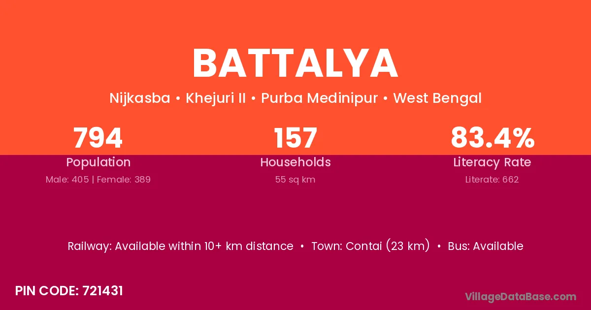 Contai (23 km) is the nearest town to Battalya village for major economic activities and is located approximately 23 km away.
