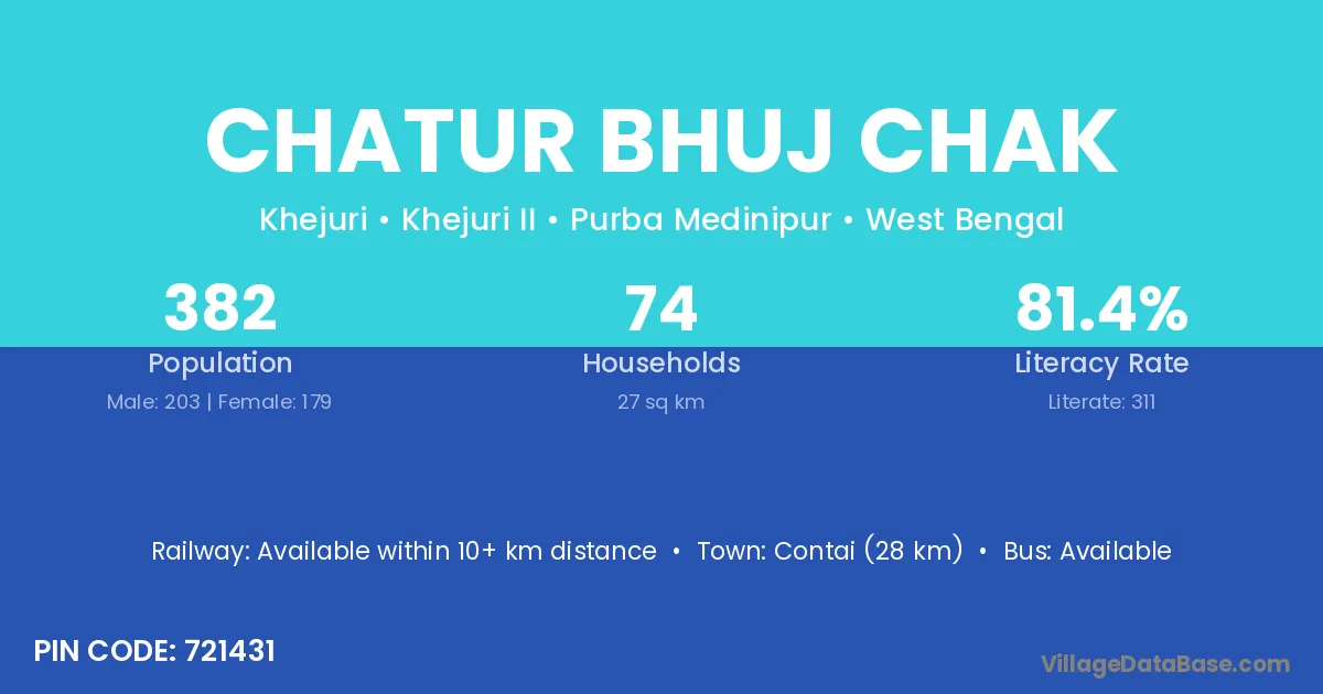 Contai (28 km) is the nearest town to Chatur Bhuj Chak village for major economic activities and is located approximately 28 km away.