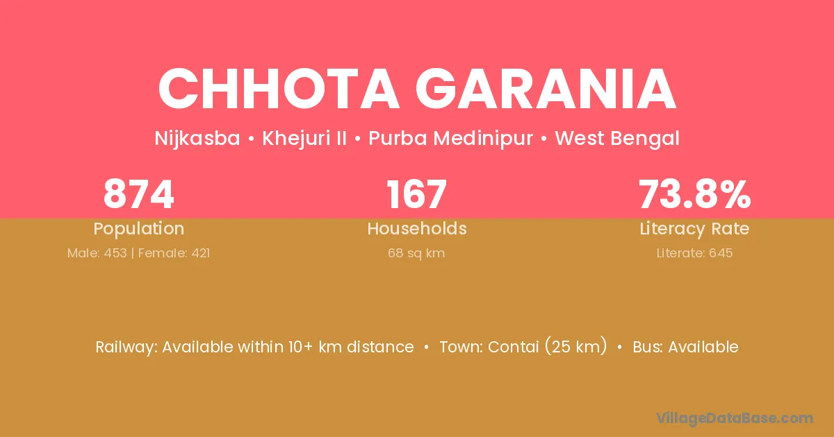 Contai (25 km) is the nearest town to Chhota Garania village for major economic activities and is located approximately 25 km away.