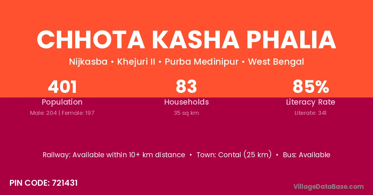 Contai (25 km) is the nearest town to Chhota Kasha Phalia village for major economic activities and is located approximately 25 km away.