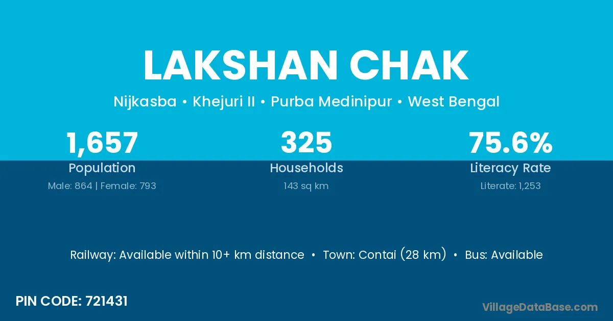Contai (28 km) is the nearest town to Lakshan Chak village for major economic activities and is located approximately 28 km away.
