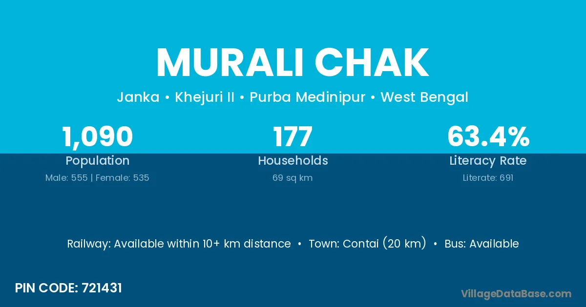 Contai (20 km) is the nearest town to Murali Chak village for major economic activities and is located approximately 20 km away.
