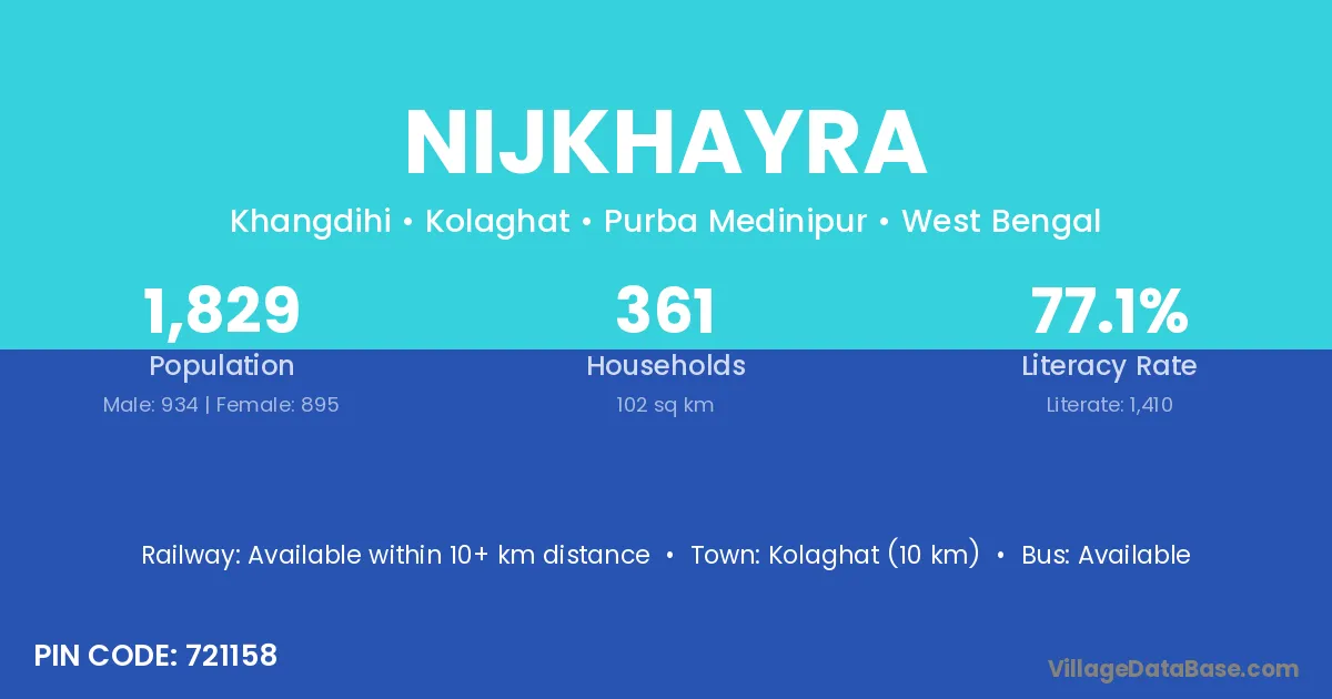Kolaghat (10 km) is the nearest town to Nijkhayra village for major economic activities and is located approximately 10 km away.