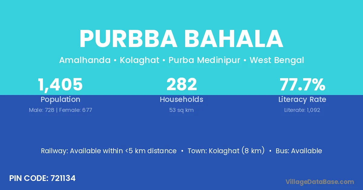 Kolaghat (8 km) is the nearest town to Purbba Bahala village for major economic activities and is located approximately 8 km away.