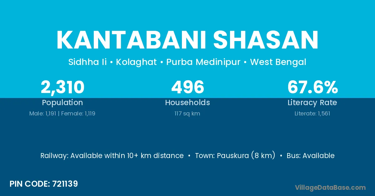 Kantabani Shasan village has a total population of 2,310 people, of which 1,191 are males and 1,119 are females.