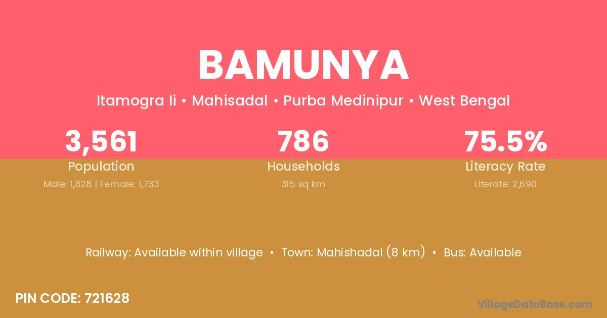 Mahishadal (8 km) is the nearest town to Bamunya village for major economic activities and is located approximately 8 km away.
