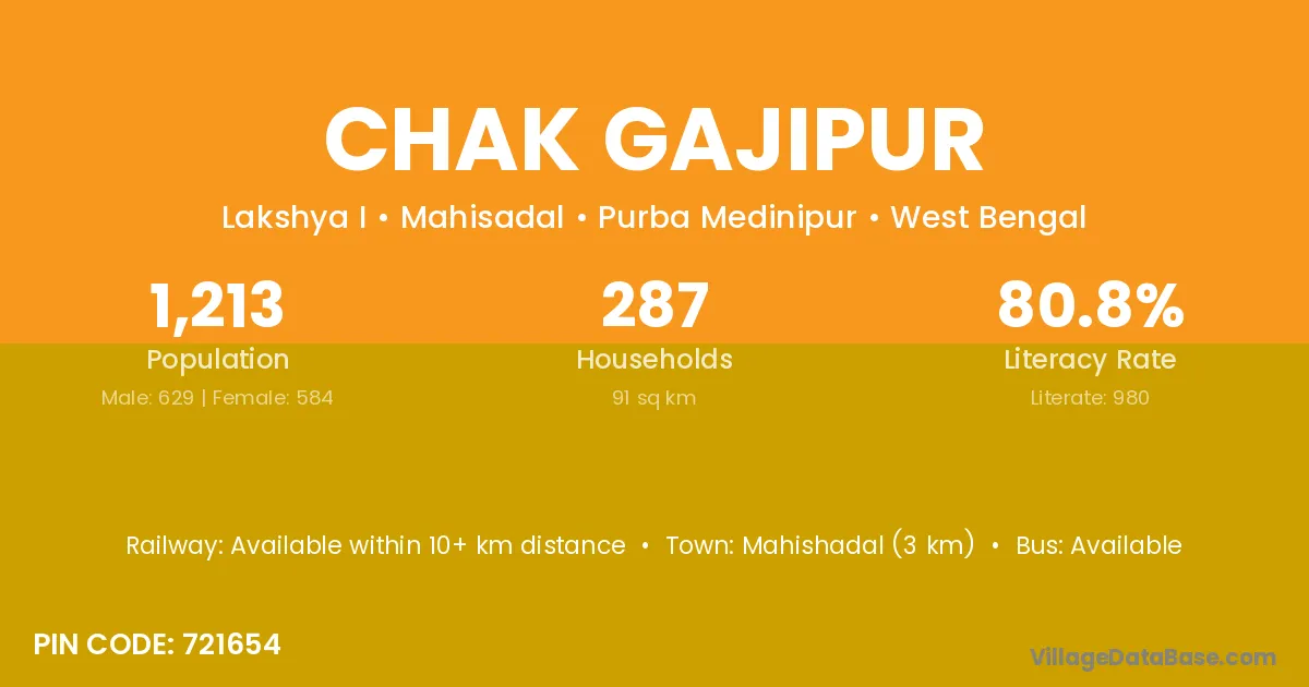 Mahishadal (3 km) is the nearest town to Chak Gajipur village for major economic activities and is located approximately 3 km away.
