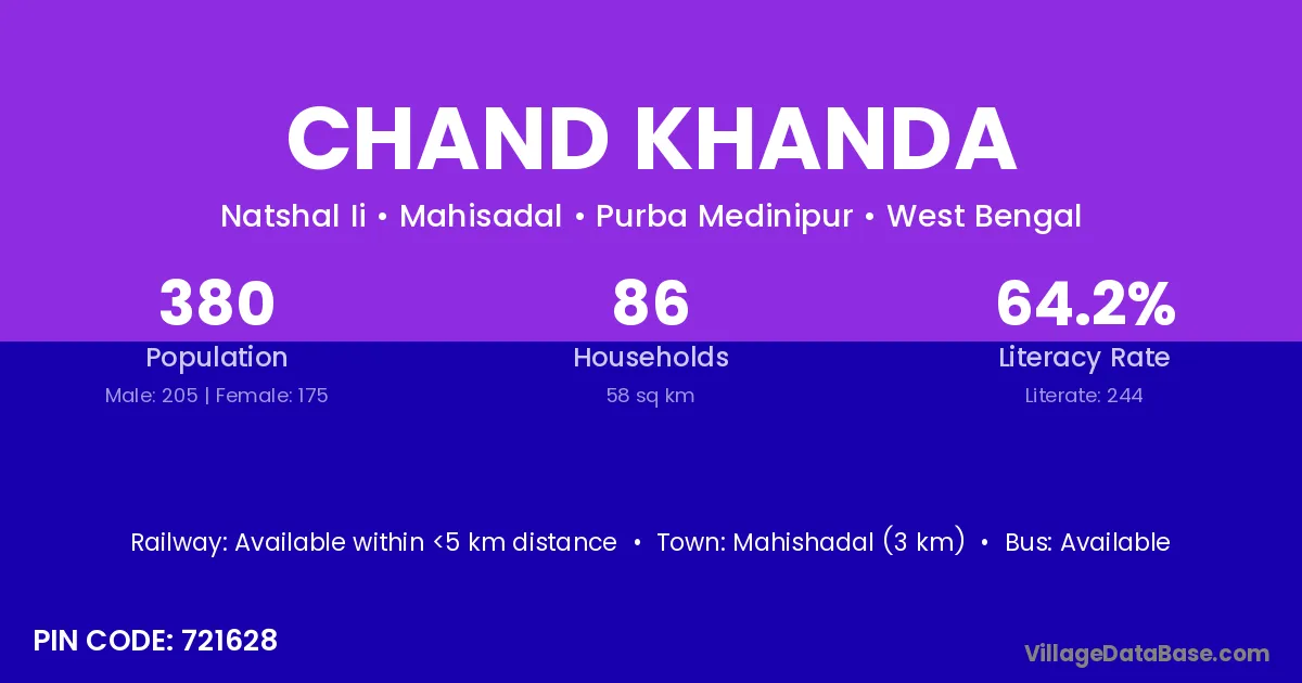 Mahishadal (3 km) is the nearest town to Chand Khanda village for major economic activities and is located approximately 3 km away.