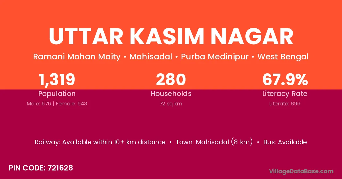 Mahisadal (8 km) is the nearest town to Uttar Kasim Nagar village for major economic activities and is located approximately 8 km away.