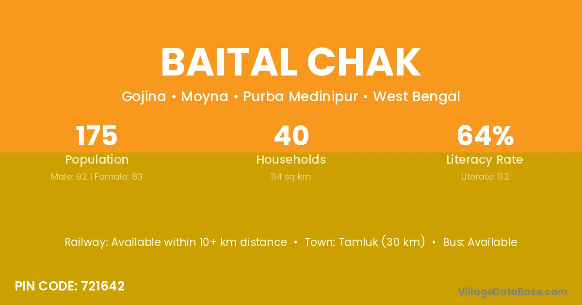 Tamluk (30 km) is the nearest town to Baital Chak village for major economic activities and is located approximately 30 km away.