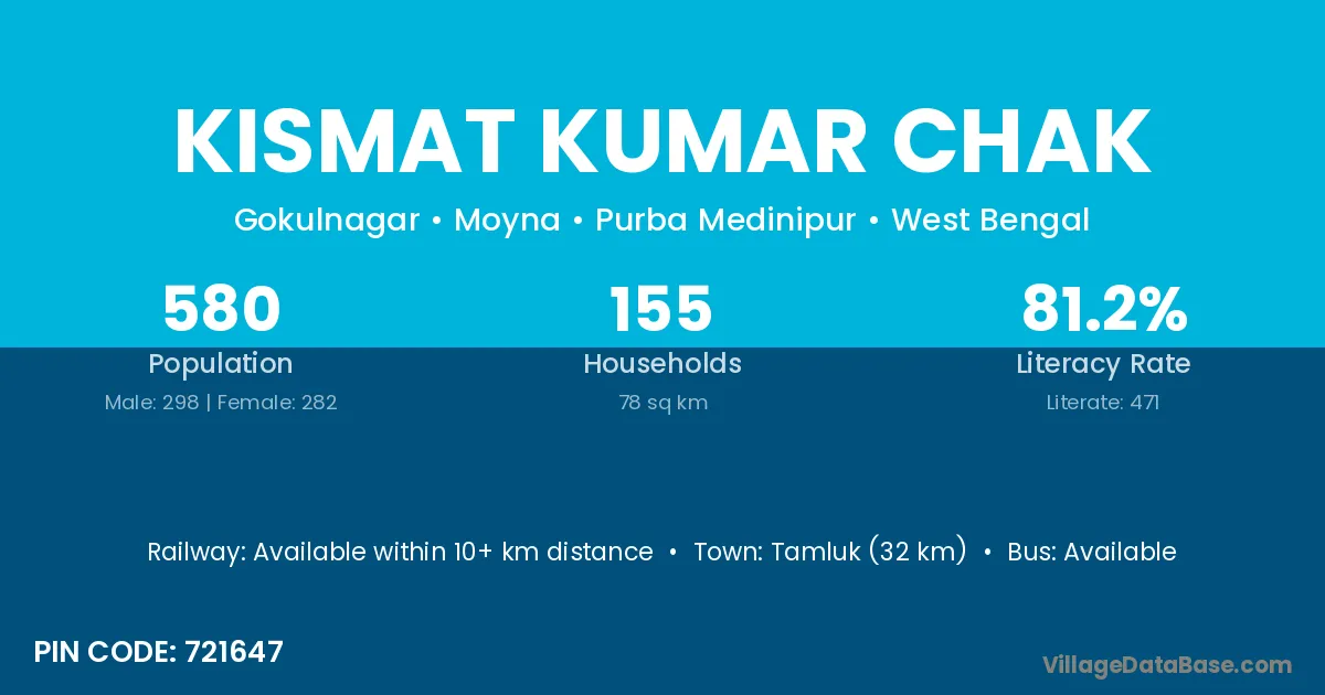 Tamluk (32 km) is the nearest town to Kismat Kumar Chak village for major economic activities and is located approximately 32 km away.