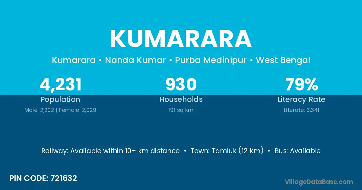 Tamluk (12 km) is the nearest town to Kumarara village for major economic activities and is located approximately 12 km away.