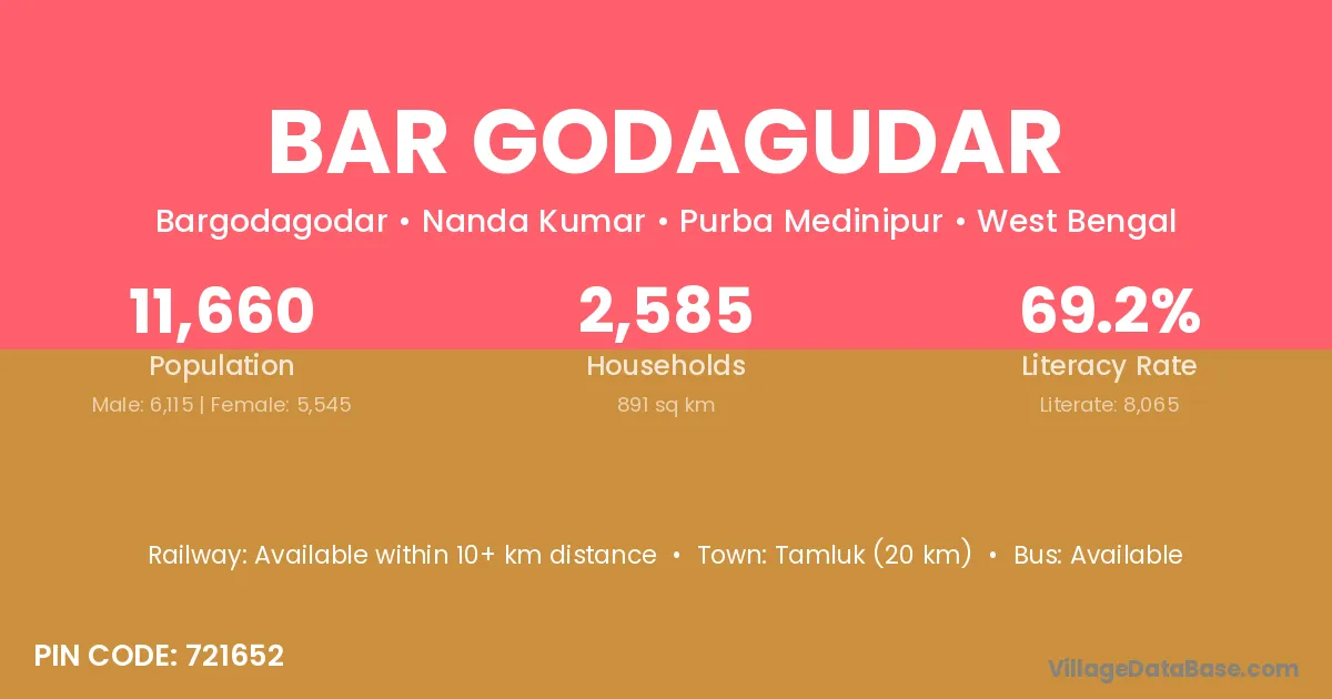 Tamluk (20 km) is the nearest town to Bar Godagudar village for major economic activities and is located approximately 20 km away.
