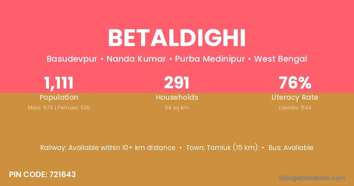 Tamluk (15 km) is the nearest town to Betaldighi village for major economic activities and is located approximately 15 km away.