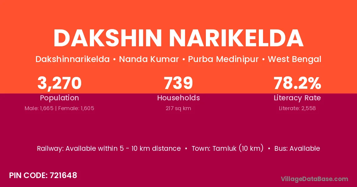 Tamluk (10 km) is the nearest town to Dakshin Narikelda village for major economic activities and is located approximately 10 km away.