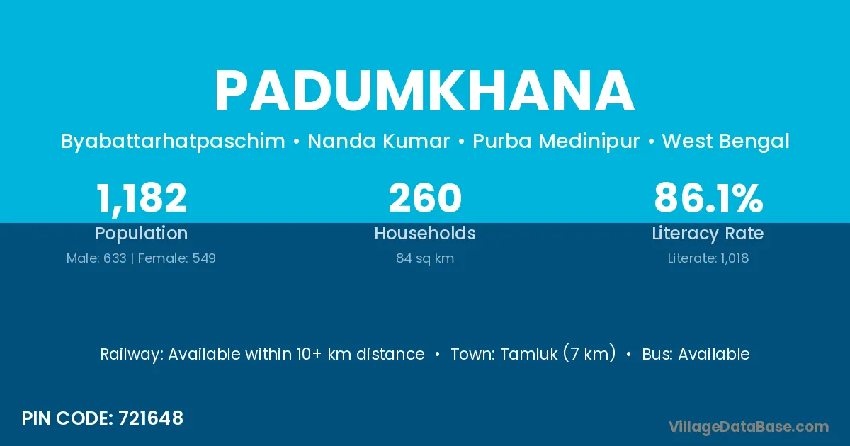 Tamluk (7 km) is the nearest town to Padumkhana village for major economic activities and is located approximately 7 km away.
