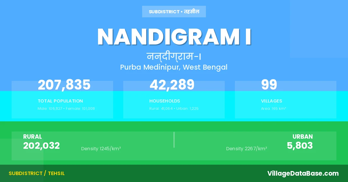 According to the 2011 census The total area of Nandigram I Subdivision is 165 km², with a population of 207835 people. The population density is 1,261 inhabitants per square kilometre, and there are approximately 42289 houses in the sub district.