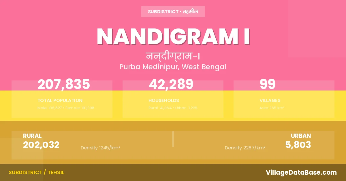 According to the 2011 census The total area of Nandigram I Subdivision is 165 km², with a population of 207835 people. The population density is 1,261 inhabitants per square kilometre, and there are approximately 42289 houses in the sub district.
