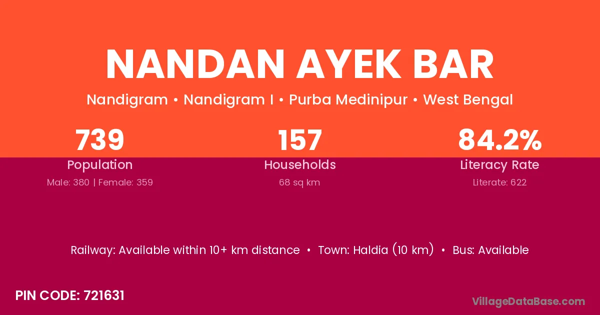 Haldia (10 km) is the nearest town to Nandan Ayek Bar village for major economic activities and is located approximately 10 km away.
