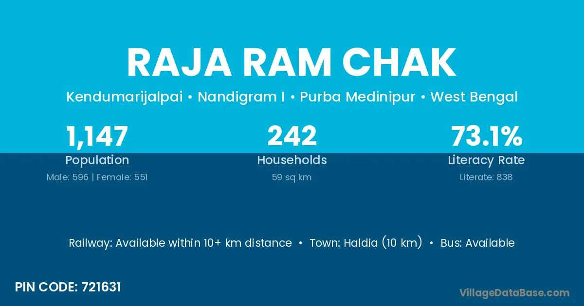 Haldia (10 km) is the nearest town to Raja Ram Chak village for major economic activities and is located approximately 10 km away.