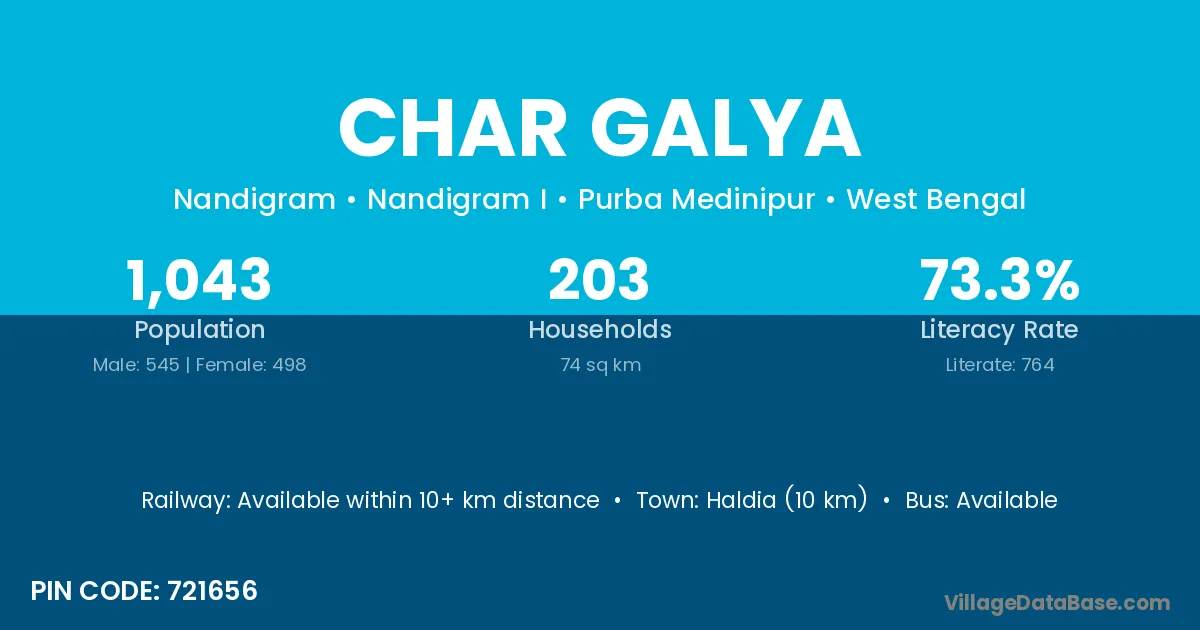 Char Galya village is located in the Nandigram I Subdivision of the Purba Medinipur district in West Bengal.