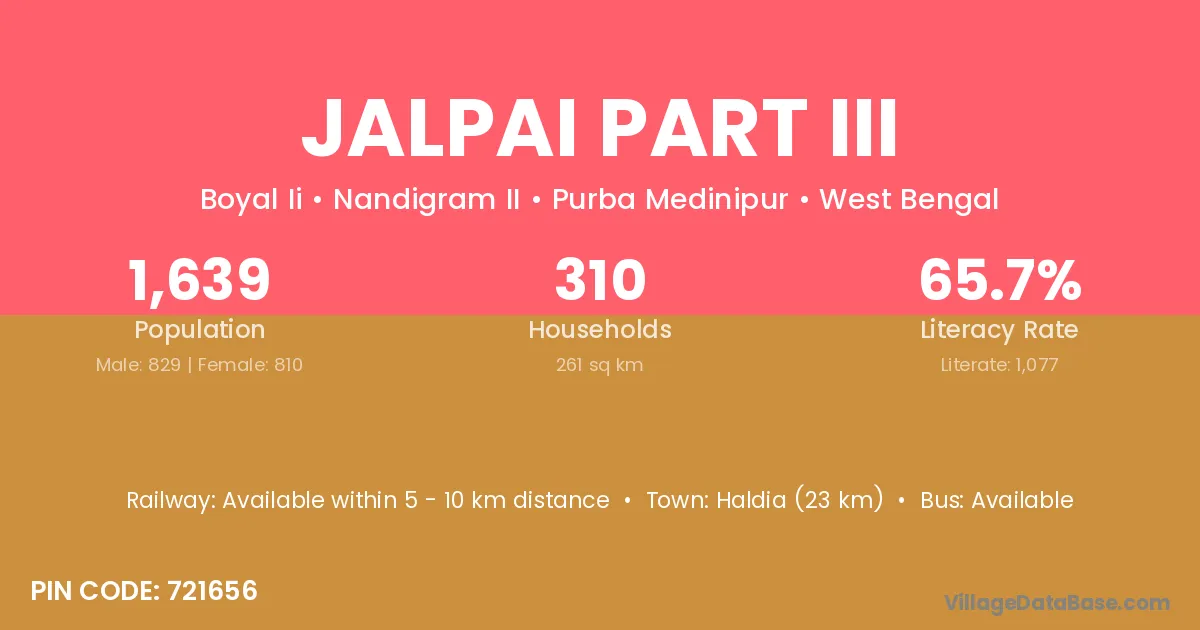 Haldia (23 km) is the nearest town to Jalpai Part Iii village for major economic activities and is located approximately 23 km away.
