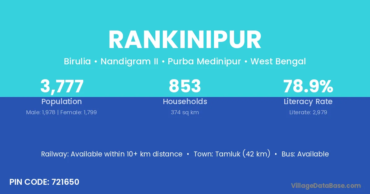 Tamluk (42 km) is the nearest town to Rankinipur village for major economic activities and is located approximately 42 km away.