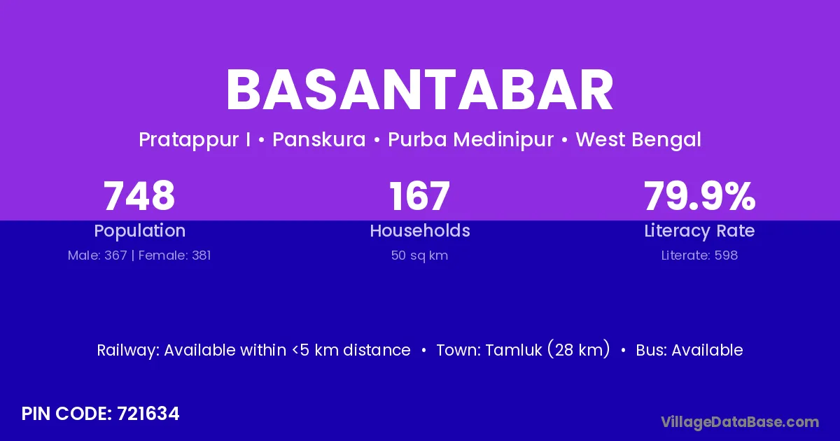 Tamluk (28 km) is the nearest town to Basantabar village for major economic activities and is located approximately 28 km away.