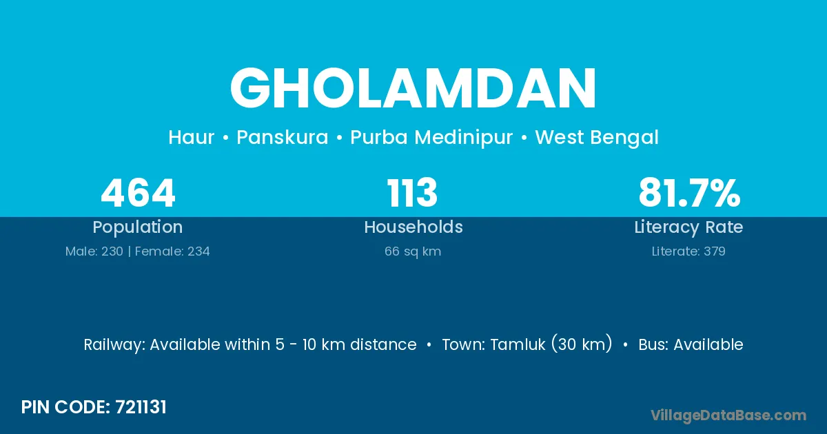 Tamluk (30 km) is the nearest town to Gholamdan village for major economic activities and is located approximately 30 km away.