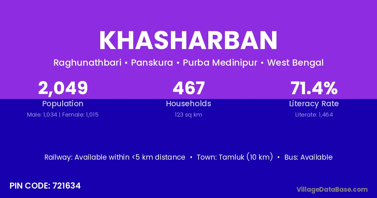 Tamluk (10 km) is the nearest town to Khasharban village for major economic activities and is located approximately 10 km away.