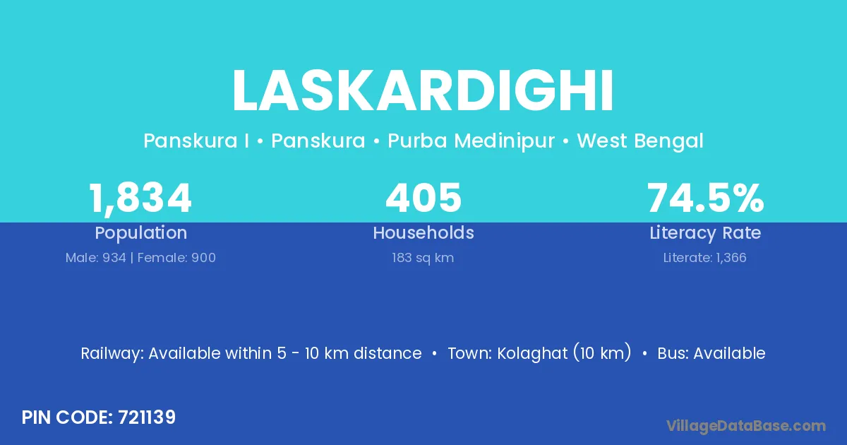Kolaghat (10 km) is the nearest town to Laskardighi village for major economic activities and is located approximately 10 km away.